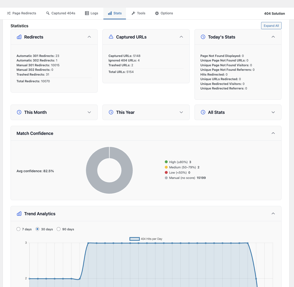 Statistics β Summary cards for redirects, captured URLs, and daily stats. Match confidence donut chart and 30/90-day trend analytics for 404 hits.