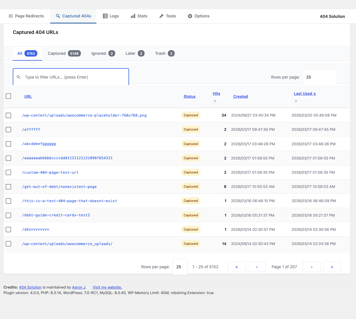 Captured 404s β Every unhandled 404 logged with URL, hit count, first-seen and last-seen timestamps. Filter by captured, ignored, or later status.