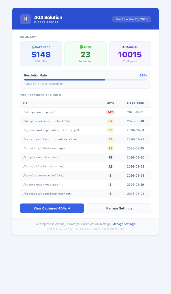 Email Digest β Weekly HTML email summarizing captured 404s, resolution rate, and a ranked table of top 404 URLs with color-coded hit badges.