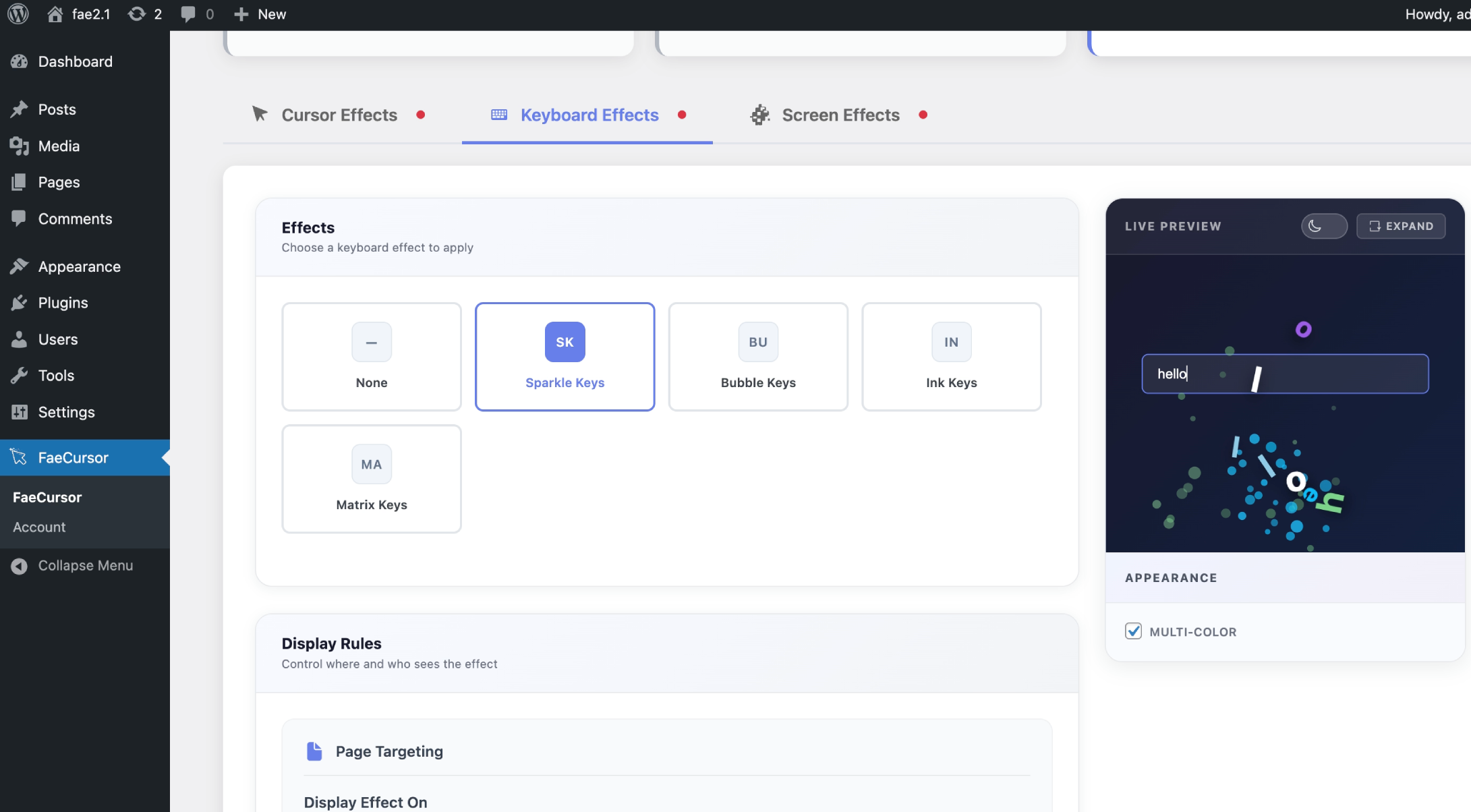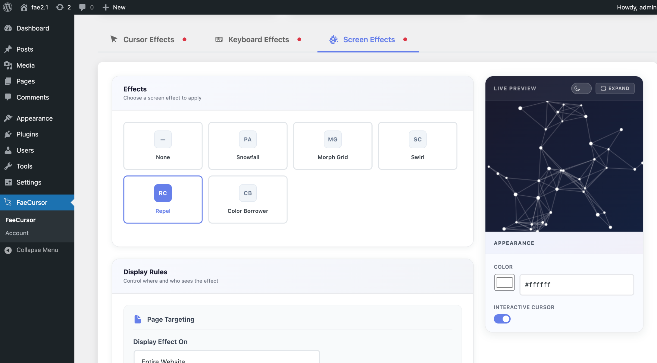 - Go to the FaeCursor settings page in your WordPress dashboard to configure effects.