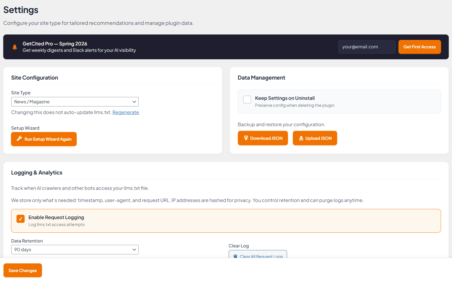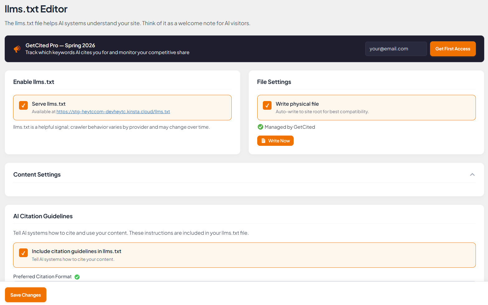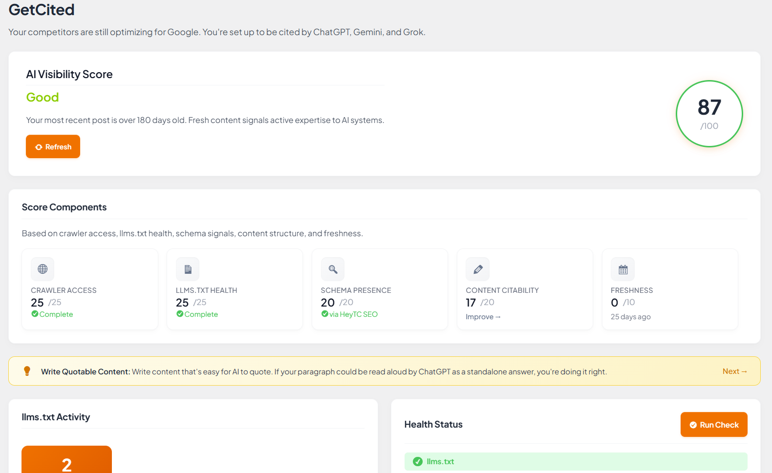 - Improved: Removed unnecessary “Keep existing” option – GetCited is THE llms.txt solution