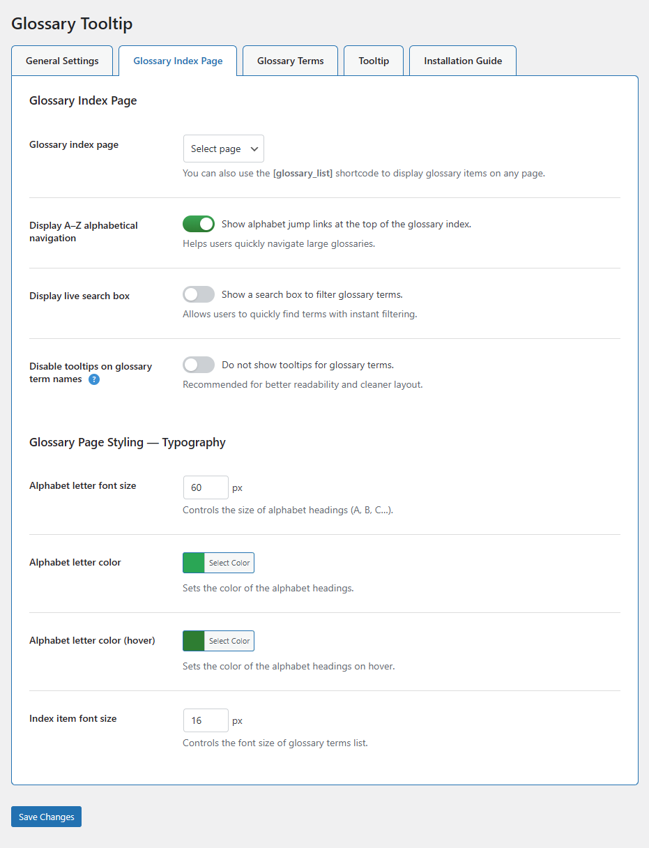 Yes. You can create a glossary index page and display the glossary list with selecting glossary list page in plugin settings or using the shortcode: