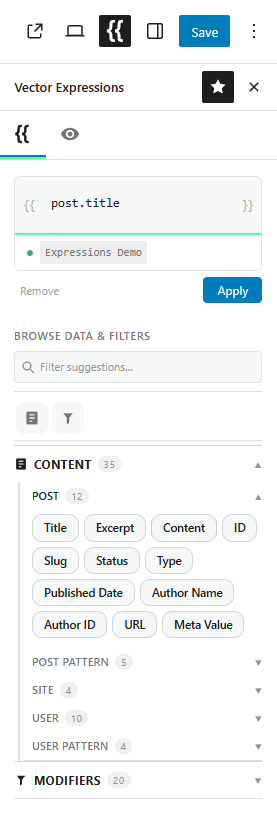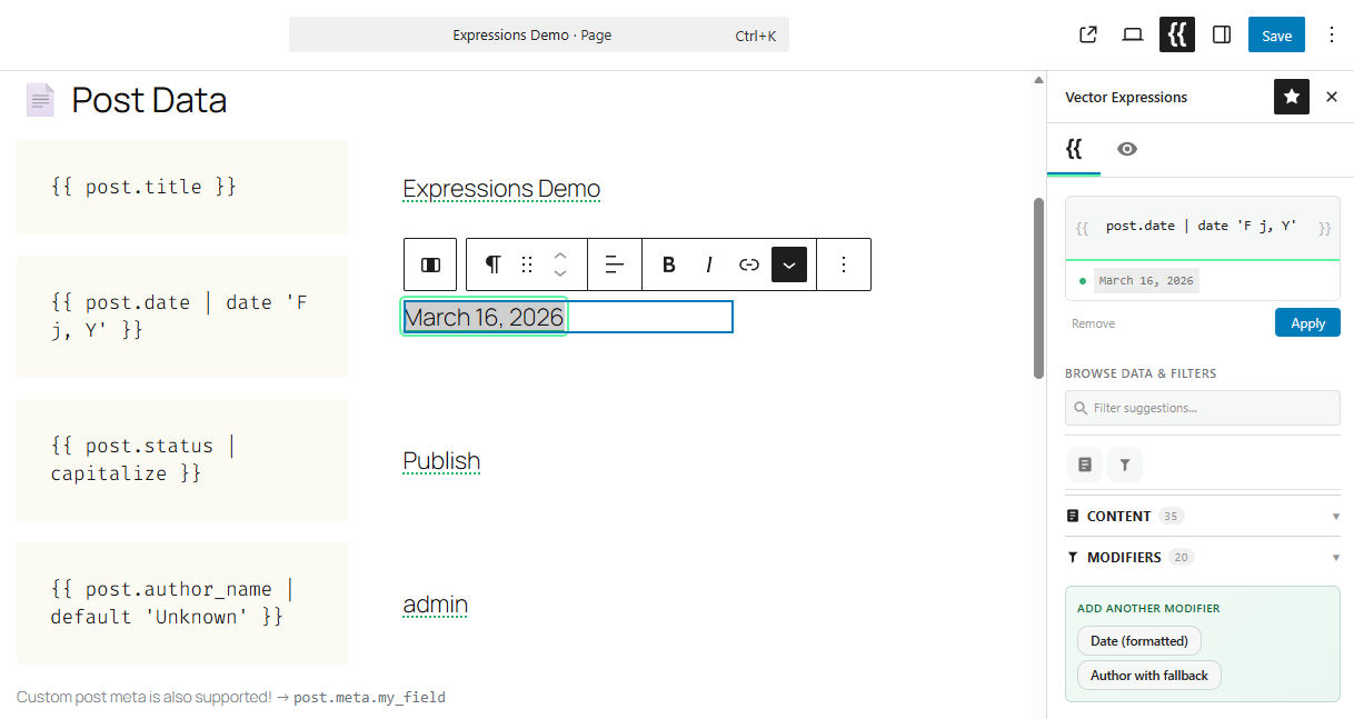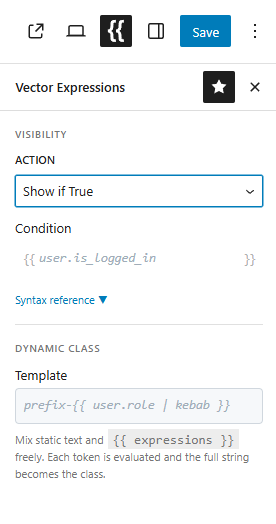 upper/uppercase,lower/lowercase,upper_first/capitalize,truncate,trim,replace,kebab,default,if,match,map,join,prop/get,get_post,get_user,get_meta,date,esc_html,esc_attr,raw, andrender. - Features: Block visibility control — Every Gutenberg block gains a Vector Logic panel. Set show/hide conditions with an expression evaluated per-render.