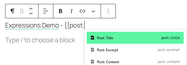 Add an expression to any block’s text content by typing {{ and selecting your expression from the autocomplete menu. The plugin will automatically format it as an expression chip.